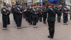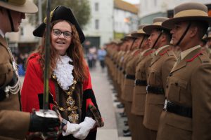 The ceremony outside Folkestone’s Town Hall featured a formal inspection and speeches from Major (Retd) Dennis Bradley BEM DL and the Worshipful Town Mayor of Folkestone, Cllr Lucy McGirr. Lt Col. John Jeffcoat then formally requested the Mayor’s permission to exercise this historic honour, after which the parade stepped off through the town.
